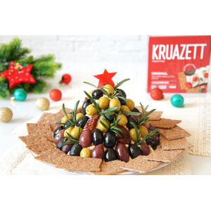 Выложите "ёлочку" маслинами, оливками, томатами, начиная снизу. Смажьте оливковым маслом для блеска. |