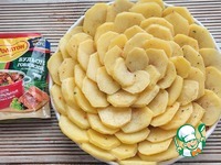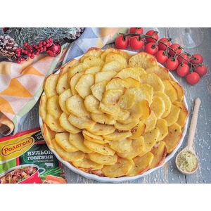 Сверху картофель посолить и посыпать 1/2 ч. л. специями бульона "Роллтон". Готовить в духовке, заранее разогретой до 200 гр., 25 мин-30 мин. |