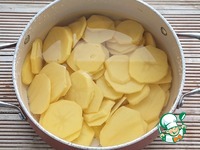 Картофель почистить, помыть. Нарезать кружочками, толщиной, примерно, 0.5 см. Поместить картофель в кастрюлю, залить водой, поставить на огонь. Довести до кипения и варить 2 мин. Слить воду. |
