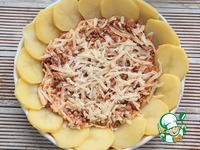 Начинаем раскладывать картофель по кругу внахлест. Дольки картофеля надо, как бы, втапливать в мясную начинку. |