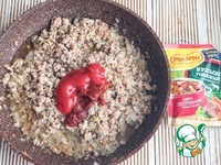 К обжаренному фаршу с луком вылить бульон, добавить томатную пасту и кетчуп. Хорошо перемешать и готовить на плите ещё 5-7 мин. |