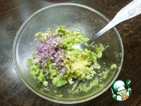 Авокадо размять вилкой. Мелко нарезать салатный (не острый) лук и чеснок. |