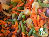 Овощную смесь (я использую "Карибскую смесь") выложить в кипящую воду. Варить после закипания 3 минуты. Овощи откинуть на дуршлаг. Бульон оставить, остудить. |