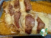 Лук порезать полукольцами, сыр порезать на пластины. В разрезы мяса положить лук и сыр. |