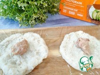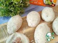 Каждую заготовку из рыбного фарша разомните руками в лепёшку. В центр положите кусочек печени трески (5 граммов). |