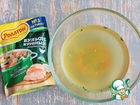 В 250 мл. кипятка развести 1 ч. л. куриного бульона "Роллтон". Дать получившемуся бульону остыть. |