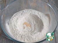 Влить в него остывший бульон. Начинаем замешивать тесто, подсыпая необходимое количество муки. |