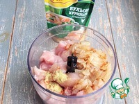 В блендер поместить нарезанное куриное филе, обжаренные лук, чеснок и 1/2 ч. л сухого куриного бульона "Роллтон". |