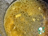 Нагреть желатин, постоянно помешивая. Добавить оставшийся бульон. Желатин должен полностью раствориться. |