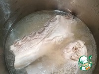 В кипящую воду кинуть лук в шелухе, предварительно помытый, очищенный от шелухи чеснок, укроп, вино, сухой бульон и во все это кинуть свиные ребра и варить 30 минут |
