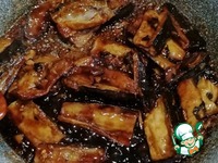 В сковороде, где жарились баклажаны положить натертый или молотый имбирь, резанный чеснок, немного обжарить примерно 1 минуту. Влить соевый соус, бульон, уксус, сахар, паприку. |