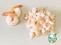 Креветки отварить и порезать, оставить 2 шт для декора. |