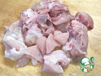 Подготовленную курицу нарезать небольшими порционными кусочками. |