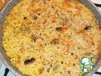 Булгур промываем и заливаем небольшим количеством воды, оставляем замоченным на 15 минут. Добавляем в сковороду и равномерно распределяем. |