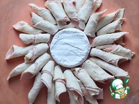 Раскатать ещё 200 гр. слоеного теста, в центре вырезать круг размером с сыр камамбер. |