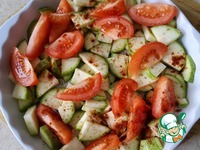 Помидоры помыть, порезать дольками, разложить между кабачком. Чеснок мелко порезать и посыпать овощи, так же посолить, поперчить и посыпать копчёной паприкой. |