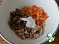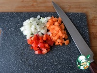 Овощи моем, чистим. Режем кубиками лук, морковь, болгарский перец. |