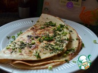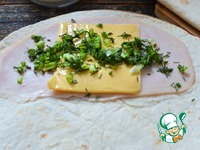 На половинку лепёшки выложить ломтик ветчины, на него пластинку сыра. |