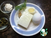 На мелкой терке натереть вареные яйца, чеснок и плавленый сырок. Измельчить каперсы и укроп. Всё смешать и заправить майонезом. |