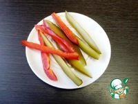 Сладкий перец и маринованный огурец нарезать тонкой соломкой. |