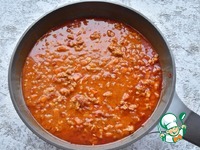 Подбавляю томатную пасту, воду, молоко. Накрываю сковороду крышкой и на медленном огне томлю соус еще 30 минут. |