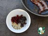 Измельчаю ножом курагу, орехи кешью, листочки розмарина и поджаренный бекон. Помещаю все составляющие в миску, добавляю клюкву, винный уксус и перемешиваю. |