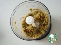 Для зелёного паштета сложите в чашу измельчителя оливки, орехи, тыквенные семечки, корнишоны, вяленые томаты, песто, зубчик чеснока. |