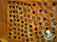 4. На нее выливаем тесто и укладываем на него порезанные маслины.