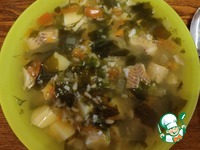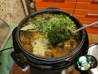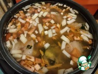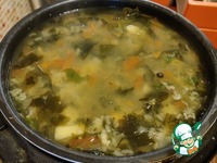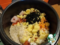 Закладываем все ингредиенты для супа в чашу мультиварки. Водоросли обязательно нужно очень мелко измельчить в руках, иначе они потом будут плавать в супе большими хлопьями! |