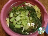 Черешок сельдерея режем на кусочки, также срезаем с черешков листики. Чеснок чистим. Моем сельдерей, чеснок и укроп в отдельной таре. |