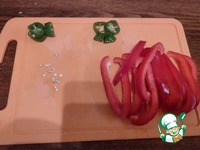 Горький перец режем кружочками, а сладкий нарезаем соломкой. Крупный чеснок нарезаем дольками поперёк зубчиков, если мелкий, то вдоль. |
