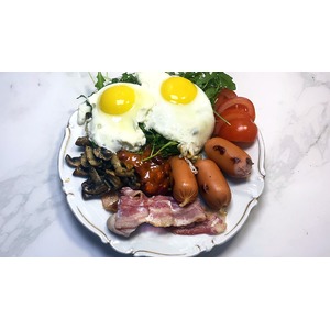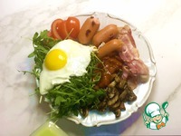 Когда все подготовлено на тарелку кладем бекон, грибы, помидоры, фасоль, рукколу и на рукколу кладем яичницу. |