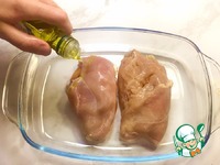 Потом куриные рулетики поливаем оливковым маслом, посыпаем прованскими травами и отправляем в духовой шкаф при 180 градусах на 30 минут. |