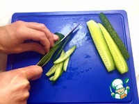 После чего у огурца убираем семена и твердую часть нарезаем тонкими слайсами. |