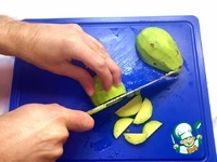 Потом у авокадо убираем косточку и мякоть тонко нарезаем. |