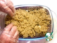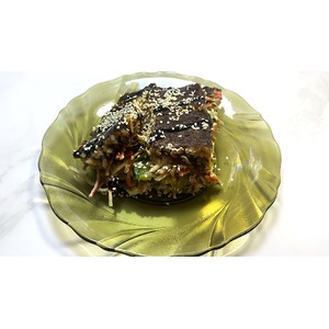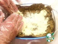 По верх нории кладем рис и придавливаем его, на рис кладем творожный сыр и равномерно распределяем его. |