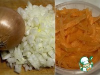 И традиционно. Лук некрупно порубить, морковку потереть на крупной тёрке. |