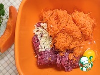 В глубокую миску к фаршу добавляем натертую на мелкой терке тыкву, нарезанный мелко чеснок и яйцо. |