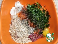 Добавляем овсяные хлопья, сметану, мелко нарезанную зелень. Солим и перчим по вкусу. Всё хорошо перемешиваем. |