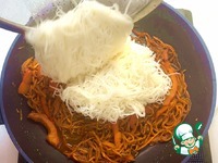 После того как фунчоза запарилась перекладываем её к овощам и хорошенько все перемешиваем. |