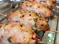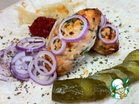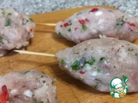Достаём шпажки из воды. Фарш из индейки делим на порции. Формируем продолговатые котлетки, напоминающие колбаски. Прокалываем котлеты шпажками, плотно сдавливаем мясо руками, чтобы получилась красивая форма. Нужно смочить руки водой, чтобы мясо не приставало к рукам. |