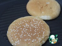 Булочки у нас уже разрезаны. Обжариваем срезами вниз. На шляпку булочки я ставила маленький груз, чтобы выровнять. |