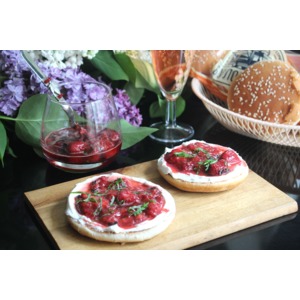 Описание: Брускетта из булочки для бургеров идеальна в сочетании с творожным сыром и маринованной клубникой. Клубника замороженная, из свежей "не то пальто". Проверено! Дома замаринуем клубнику и на пикник. Поджарим на гриле булочки для бургера с кунжутом от TM "Bagerstat" до хруста, на них сливочный сыр и полить все маринованной клубникой. С бокальчиком брюта это просто наслаждение. Пробуем?