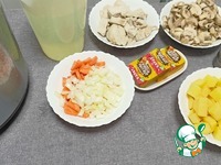 Мелко шинкуем лук и морковь. Картофель, сырки и курицу средними кусочками. Грибы для красоты слоями. |