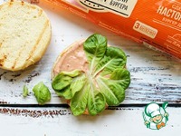 Смешайте майонез с кетчупом и смажьте нижнюю часть булочки. Уложите салатные листья. |