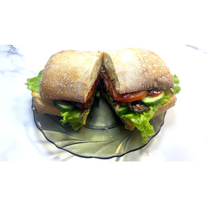Когда все приготовлено чиабатту поливаем соусом, на соус кладем листья салата, огурцы, грибы, помидоры, поливаем кетчупом, и накрываем верхней частью чиабатты. |