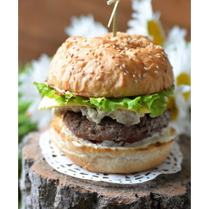 Накрываем бургер верхушкой булочки, слегка прижимаем, скрепляем шпажкой. Приятного аппетита! |
