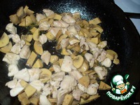 Куриное мясо отделить от косточки и нарезать достаточно мелкими кубиками. Грибы тоже нарезать. И вместе обжарить на сливочном масле (Я жарю на "Воймиксе") |