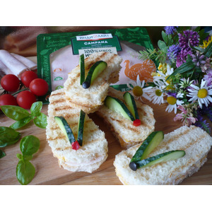 Описание: Хочу предложить рецепт простых в приготовлении сэндвичей. Начинка для них собирается из тонких ломтиков натуральной ветчины из грудки индейки ТМ "Индилайт" и плавленного сыра чеддер. Сэндвичи отлично подходят для сытного перекуса или закусок на природе или пикнике. Ещё их удобно готовить заранее, чтобы положить в холодильник. Если из сэндвича вырезать например "шлепанец", так закуска будет еще интереснее и привлекательней. Угощайтесь!