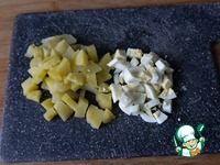 Вареные картофель и яйца чистим, режем такими же кубиками. |